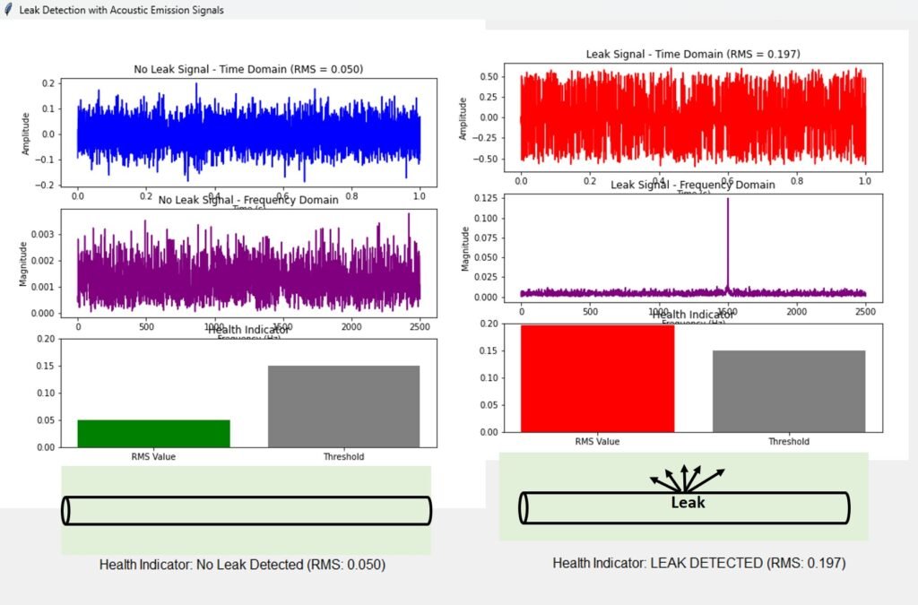 Pipelines are widely adopted in industries to transport fluids such as liquids and gases. Leaks in pipelines create interruptions in the fluid supply and disturb the plant operation causing economic losses. In addition, the leakage of harmful liquids or gases may pose a hazard to the environment and risk the safety of workers. Our solutions use acoustic emission (AE) sensors to detect and localize pipeline leaks. The AE data are processed using the right signal analysis and AI methods to detect the presence of leaks and their location.